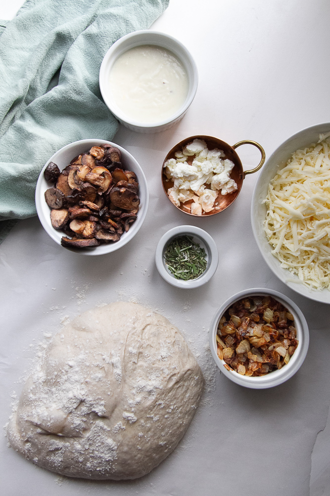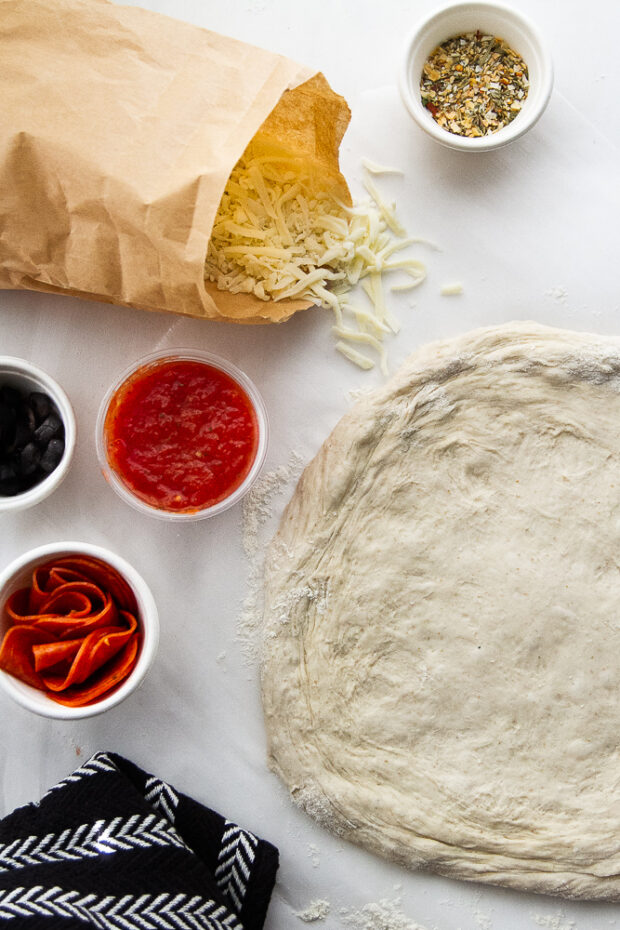 - Long fermented sourdough pizza dough, sauce, cheese, and toppings to make a 12-inch pizza.